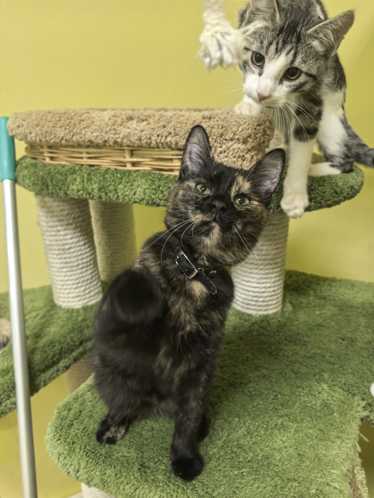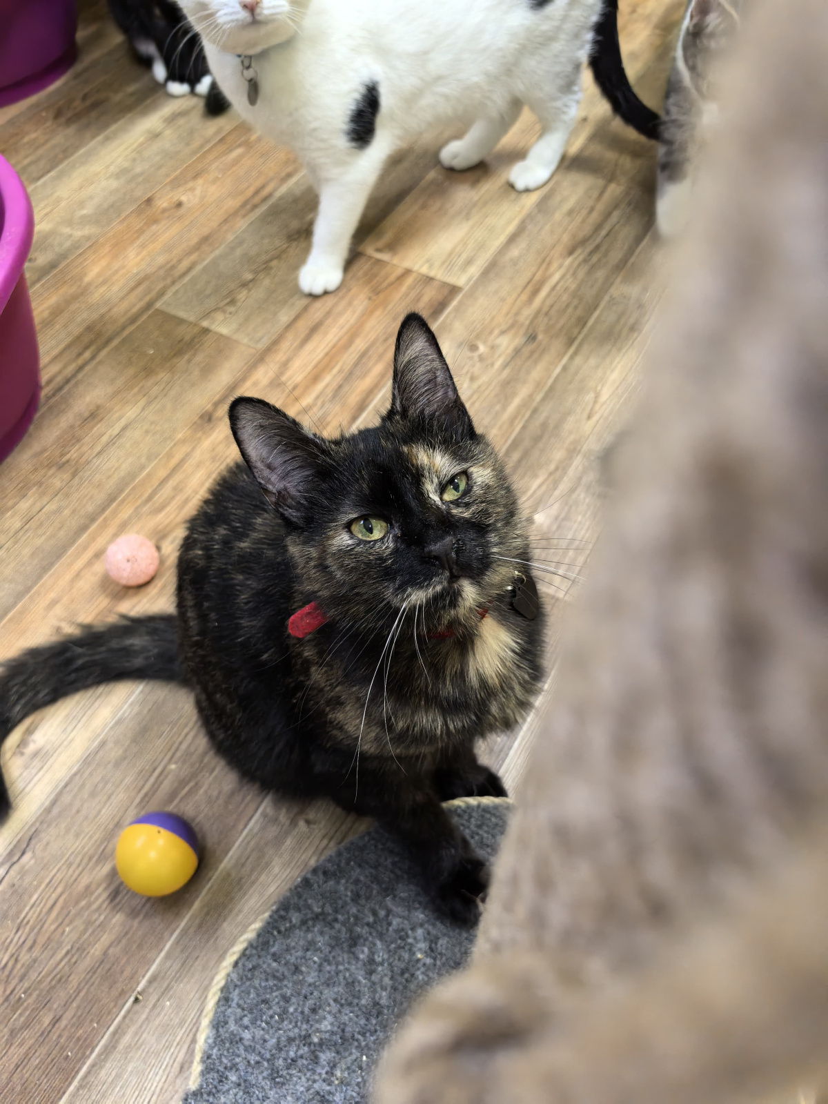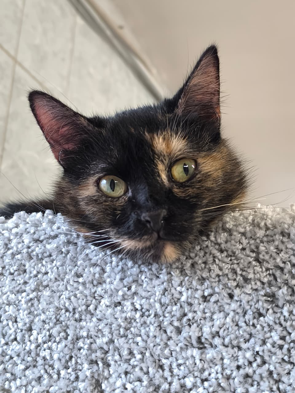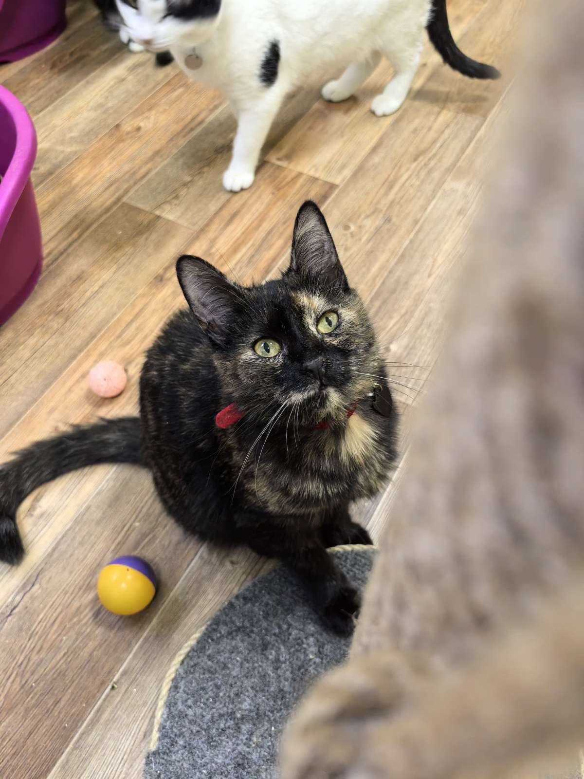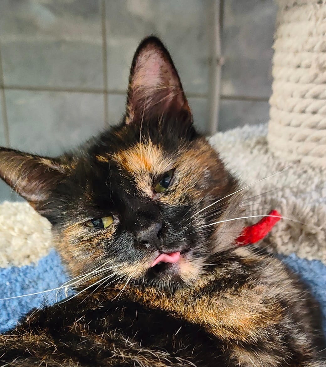 Duzya kam zusammen mit ihren Schwestern Dezzi und Debbi im Juni 2024 auf die Welt – draußen auf der Straße, ohne sicheren Platz. Zum Glück wurden die drei rechtzeitig gefunden und ins Katzenheim gebracht.