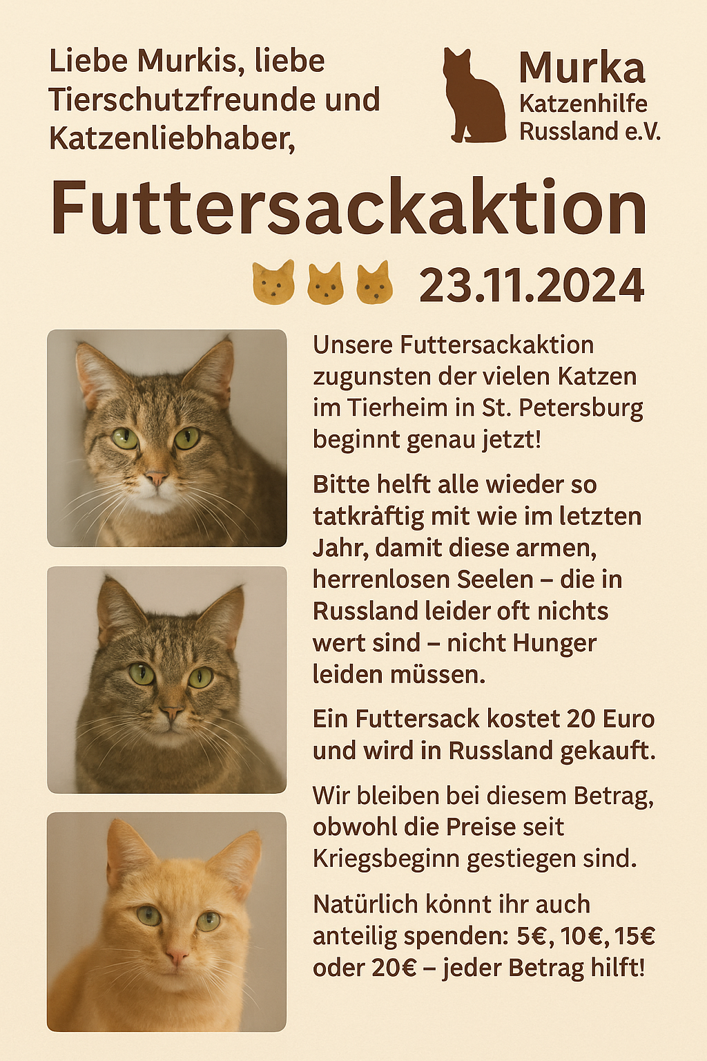 Unsere Futtersackaktion zugunsten der vielen Katzen im Tierheim in St. Petersburg beginnt genau jetzt!